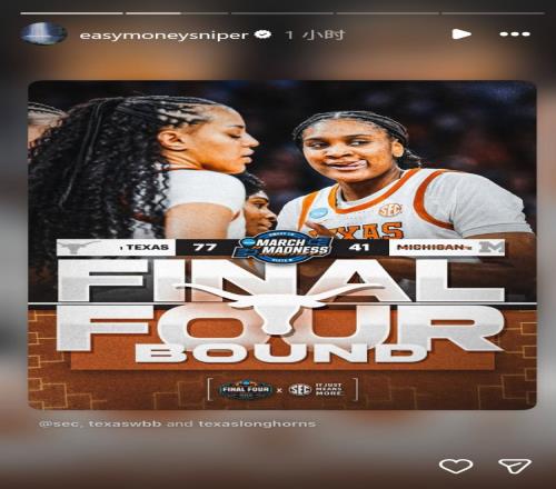 曾效力于德克萨斯大学的杜兰特在INS上晒出了克莱“四根手指”表情包,庆祝母校晋级四强。